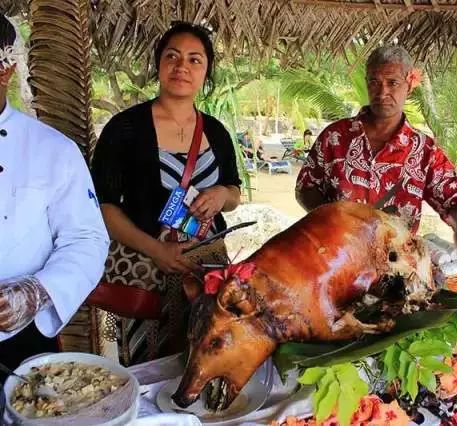 汤加美食中最引人注目的是烤全猪,而全猪宴是汤加最隆重的迎宾宴。经过柴火烤制的整只小猪,表皮焦脆里面鲜嫩。